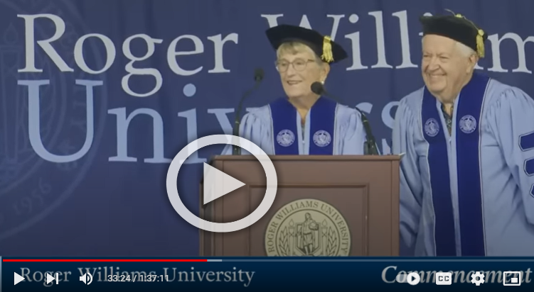Joyce and Bill Cummings visited Bristol, RI to accept honorary degrees from Roger Williams University and deliver the commencement address to the class of 2023 [timestamp 31:00].
